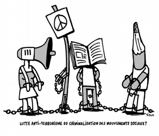 Répression de la plus engagée des résistances, aussi, lorsque sont créées des lois "antiterroristes". Au nom de la lutte contre le terrorisme, les libertés fondamentales sont bafouées. Tandis qu’un discours s’acharne à nous démontrer que seul Oussama Ben Laden et ses fils spirituels pourraient tomber sous le coup de la loi et que même eux ont droit à un avocat, quiconque est en réalité passible de poursuites. Les notions volontairement floues de la loi permettent d’enrayer toute contestation sociale remettant en cause les fondements du capitalisme ou tout acte de résistance à un envahisseur [2]. La récente grève chez Tecteo, distributeur de gaz et d’internet dans la région liégeoise aurait par exemple pu mener à des poursuites judiciaires sur base de la loi sur les infractions terroristes. Il n’en a rien été, non pas parce que les poursuites étaient juridiquement impossibles, mais bien parce que la résistance syndicale ne permet pas (encore) d’amalgamer grévistes et terroristes. A travers un dossier de fond [3], Fiona Wallers démonte les mécanismes de ces lois liberticides.
