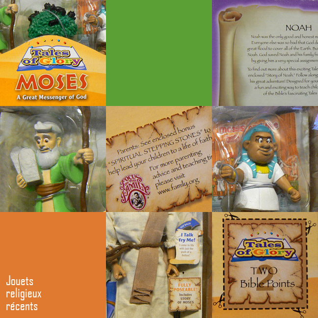 Aujourd’hui, en 2009-2010, aux Etats-Unis, c’est extrêmement fréquent d’entrer dans un supermarché Wal-Mart [1] de la "Bible Belt" ("la ceinture biblique" des Etats-Unis) et de trouver toute une série de jouets qui sont des jouets religieux : par exemple Moïse, le pharaon et les dix plaies d’Egypte ou Moïse en poupée parlante qui déclame les dix commandements etc. Là, ces jouets font évidemment partie de l’éducation hyper-religieuse qu’essaient de transmettre à leurs enfants les Américains qui font partie des groupes évangélistes, pentecôtistes ou catholiques.