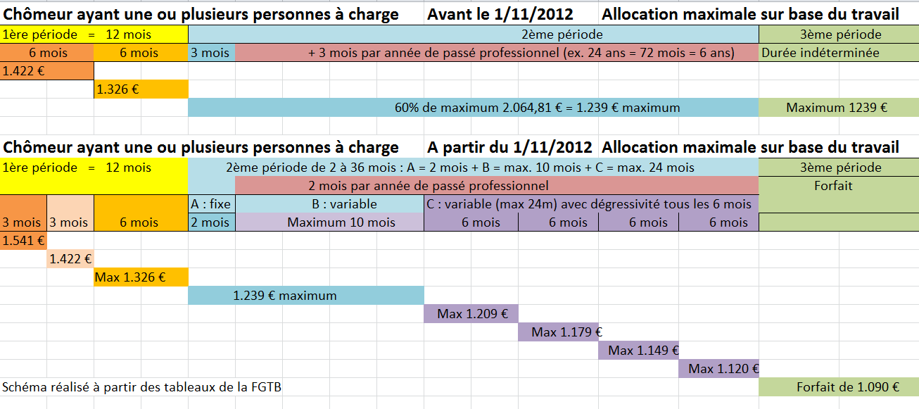 Pour le chômeur ayant une ou plusieurs personnes à charge (ce qu’on ne peut plus appeler le « taux chef de ménage »), le pourcentage restait durant toute la période de chômage de 60%. La dégressivité ne portait donc que sur les trois plafonds successifs. L’intérêt pour les plus faibles était qu’ils ne subissaient pas de dégressivité si leur salaire perdu était de maximum 2.064,81 euros (bruts) par mois.